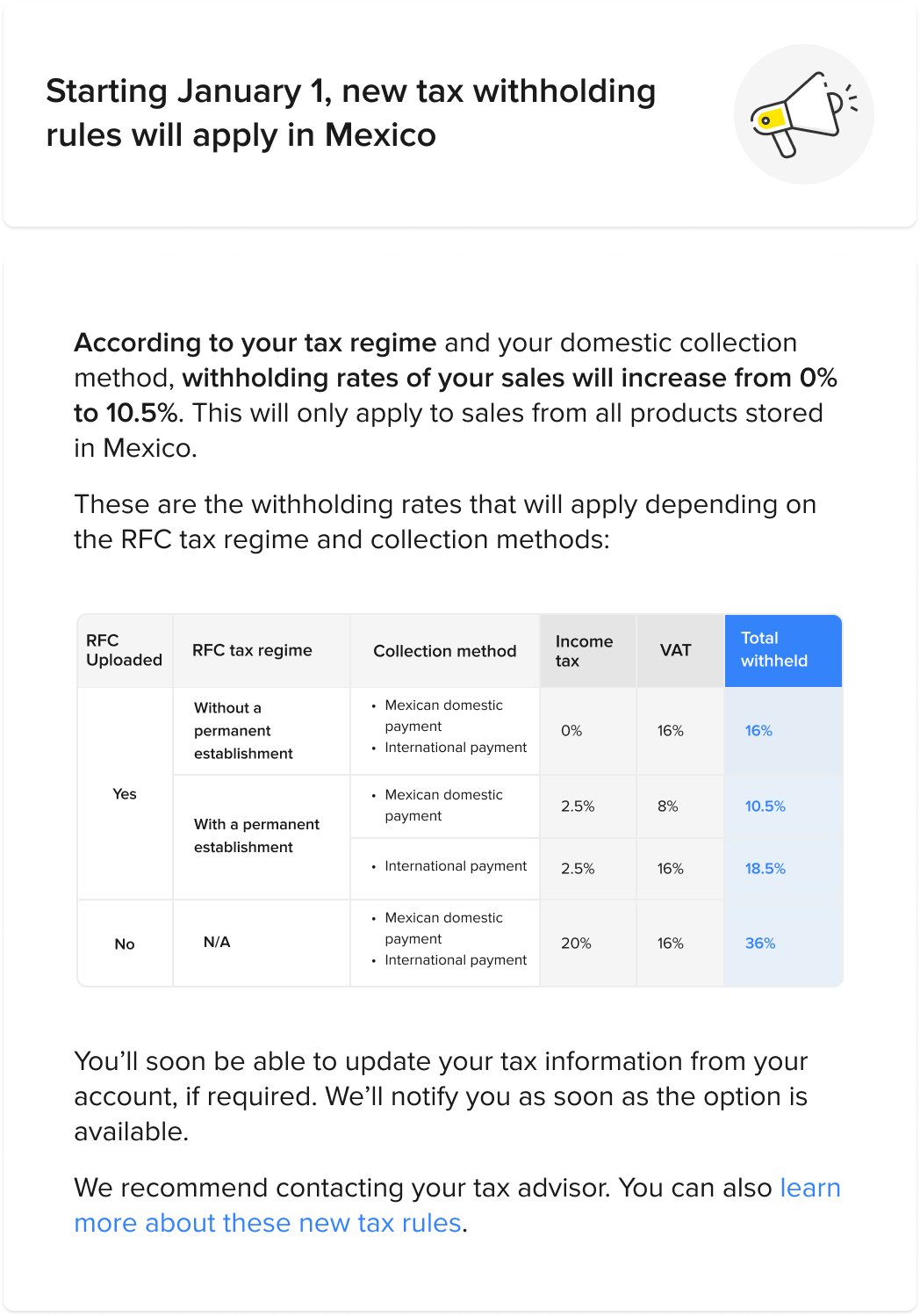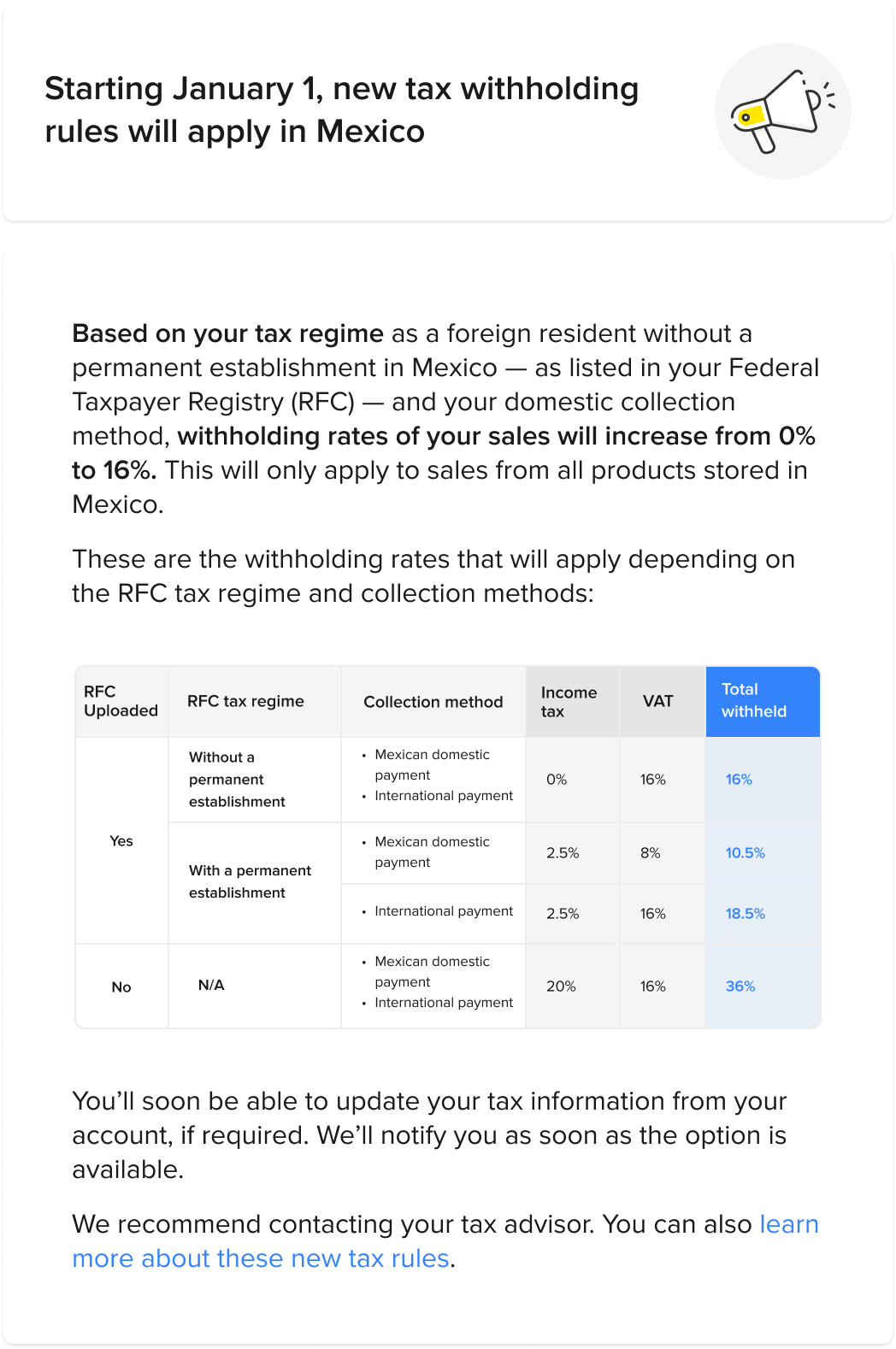 尚未上传 RFC 税号的卖家,需在 2025 年 12 月 23 日前完成上传,否则将面临销售额 36% 的预扣税费。