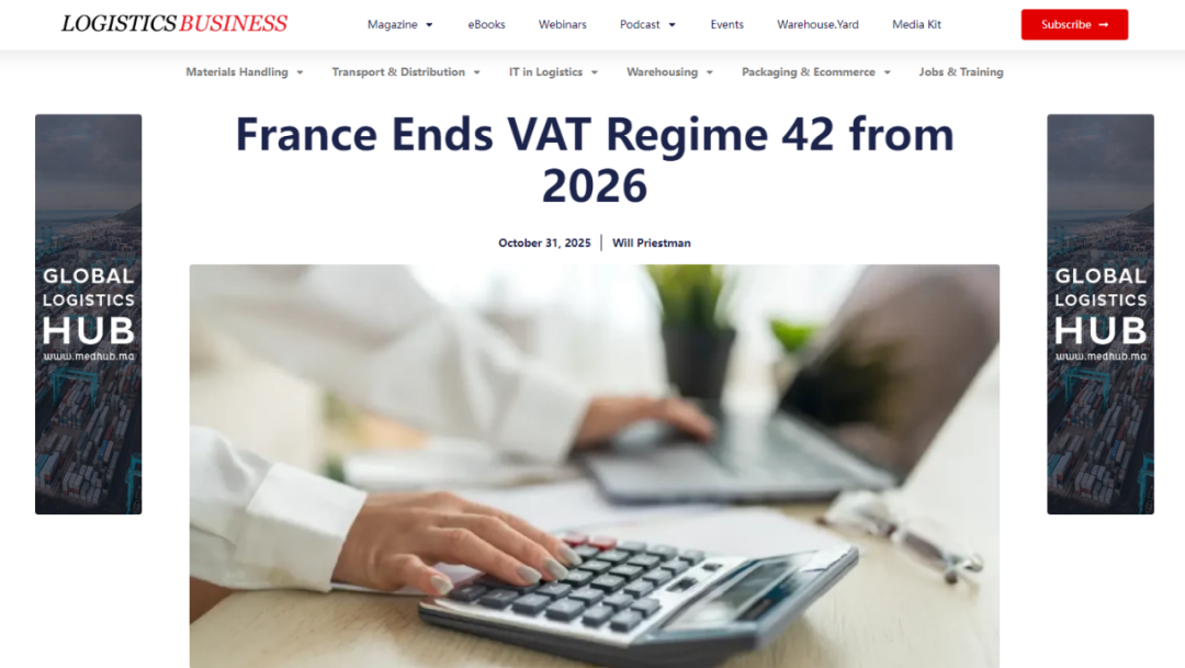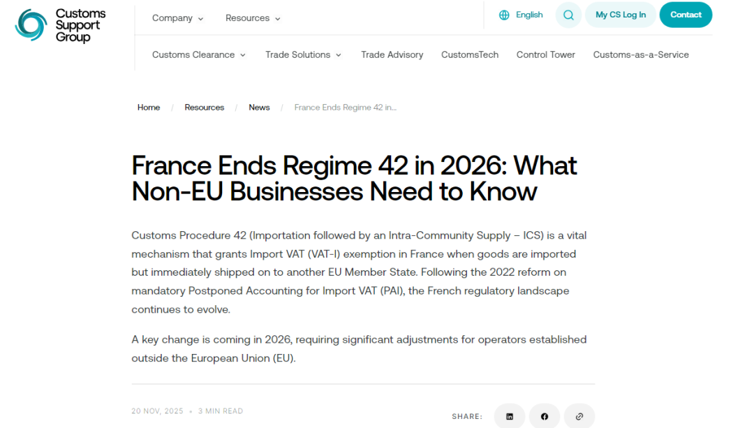 有消息称,法国自2026年1月1日起,实施数十年的非欧盟企业增值税简化清关机制——Regime 42(对应海关程序代码CPC 4200)将正式废止。