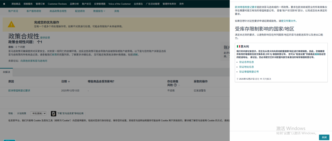 有卖家反馈,在完成意大利 VAT 注销后,亚马逊后台仍弹出 VAT 补缴提示、要求限期提交合规材料的通知,部分账号甚至被平台告知,若未及时处理相关问题,可能会影响后续站点功能的正常使用。