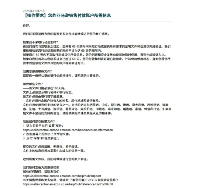 在 2025 年末,平台已出现 KYC 审核标准收紧及资金预留异常的苗头,进入 1 月后核查范围持续扩大,大量卖家中招,部分账号被冻结资金规模已达数十万欧元。