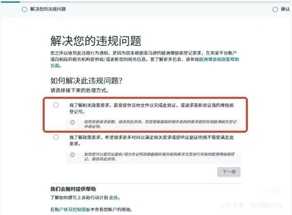 勾选了解政策要求,选择提供补充文件完成验证或重新验证增值税号。