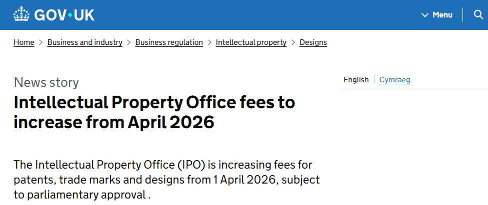 英国知识产权局(UKIPO)已公布费率调整方案,待议会最终审批通过后,将于 4 月 1 日起实施平均 25% 的官费上调。