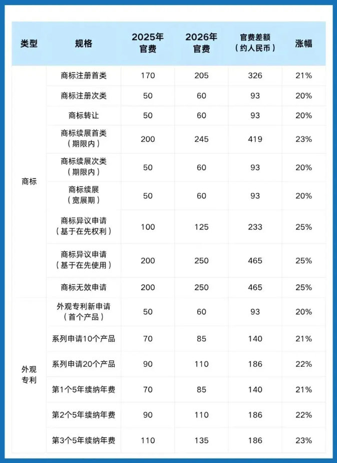 英国、欧盟、中国香港相继发布官方通知,对商标、专利、商业登记等核心合规项目的官费标准进行上调,部分类目涨幅突破 25%。