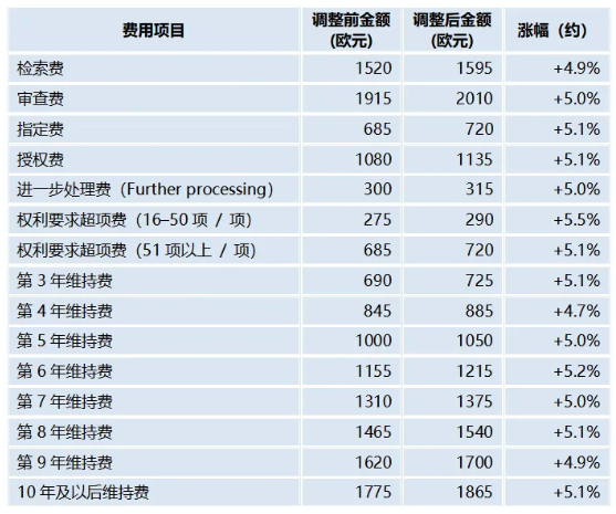 检索费、指定费、实质审查费及授权公告费均有不同幅度增长,专利第 3 至 20 年年费同步调整,第三年年费从 690 欧元上调至 725 欧元。