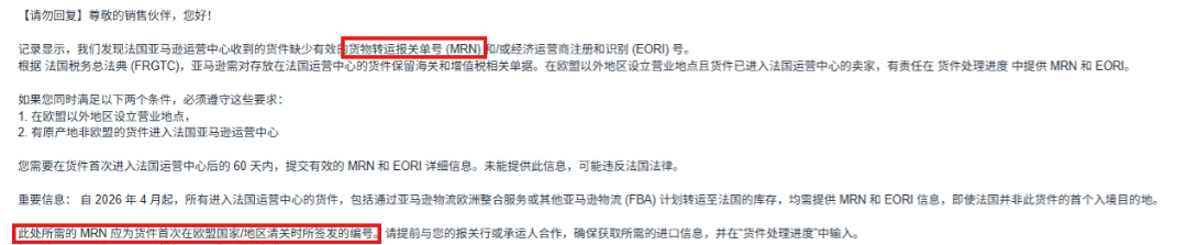 自 2026 年 4 月起正式生效,覆盖所有进入法国运营中心的库存,包括通过亚马逊物流欧洲整合服务或其他 FBA 计划转运至法国的货物 —— 即便该货件的首个入境目的地并非法国,仍需提供MRN和EORI的信息。