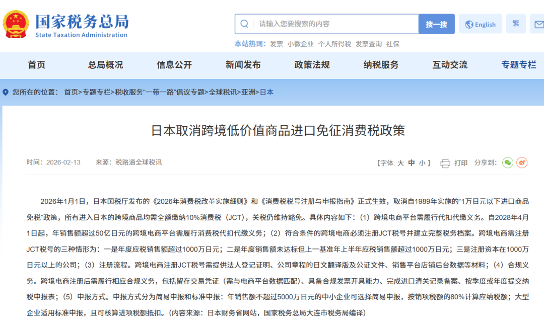 2026 年成为日本跨境电商税务合规的关键转折节点:运行 37 年的小额包裹免税政策迈入强制落地首阶段,JCT 合规发票制度过渡期迎来核心收缩期,平台、海关与税务部门的数据联网核查机制全面启动。