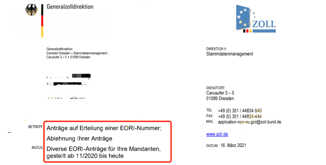 就在昨天,我们AMBER德国事务所收到海关部署的正式通知,确认离岸公司申请不了德国EORI号。