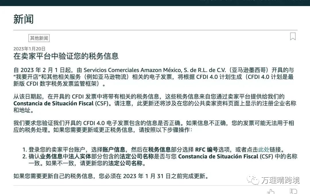 目前,亚马逊平台已经开始审核验证卖家的墨西哥RFC税号的公司名称是否和平台后台使用的名称一致,若卖家的信息不一致,将会影响卖家的账户运营。卖家如果之前使用的是个人RFC税号,建议卖家在2023年1月31日前更改RFC税务信息并且完成更新。