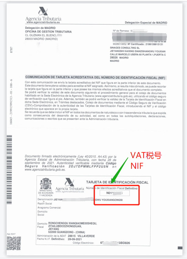 西班牙VAT注册下来后的税号就是‘NIF’,既是西班牙本地税号。