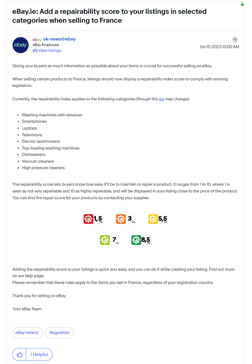 近日eBay英国、德国和意大利等多个站点发布公告提醒卖家遵守法国EPR(生产者责任延伸)法规。在法国销售某些电子设备的卖家,必须提供“可维修性指数”( repairability index)。