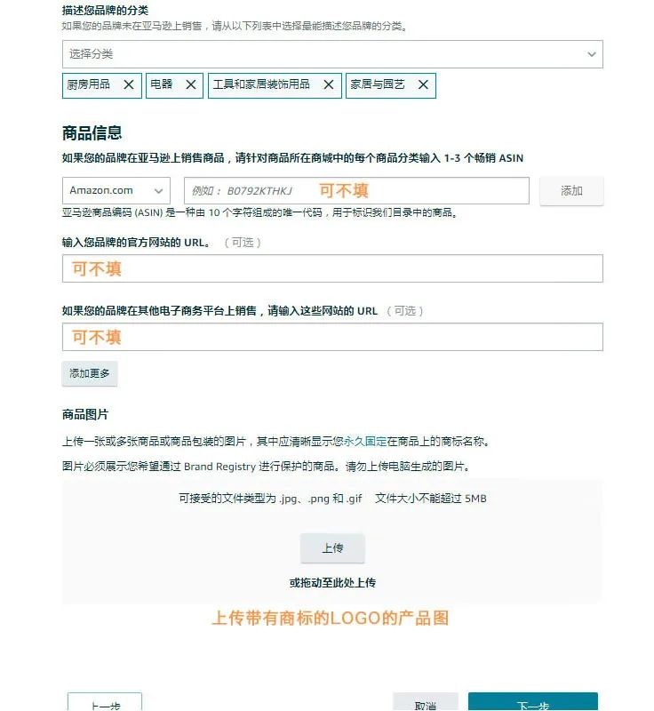1.在品牌名称输入「商标名称」,然后选择「品牌相关的商标局」,输入「商标注册号」(如果商标还在申请中则输入申请号)。
