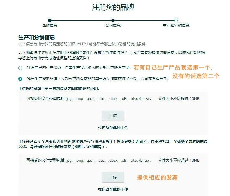 4.接着根据自身的情况选择生产和分销的信息,上传「相关发票和证明」。