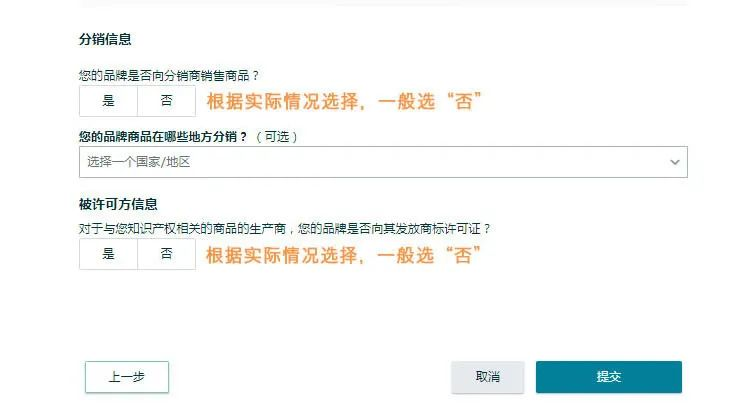 5.根据自身情况进行选择「是」或者「否」,如果品牌需要授权其他店铺的话,走授权流程就可以,这个环节新账户出现的概率较大,然后填写完成点击「提交」。