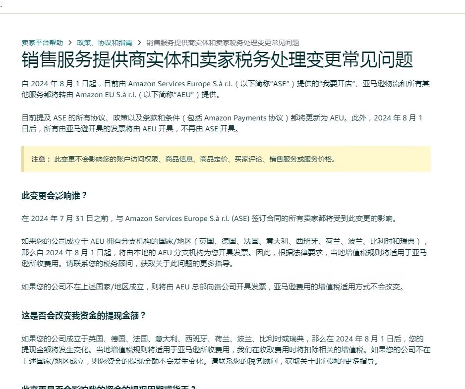 自 2024年8月1日起,目前由 Amazon Services Europe s.àrl(以下简称"ASE”")提供的“我要开店”、亚马逊物流和所有其他服务都将转由 Amazon EU s.àr.l.(以下简称"AEU")提供。PS:AEU 是 Amazon EU s.àr.l. 亚马逊的欧盟法国公司,新政策详情