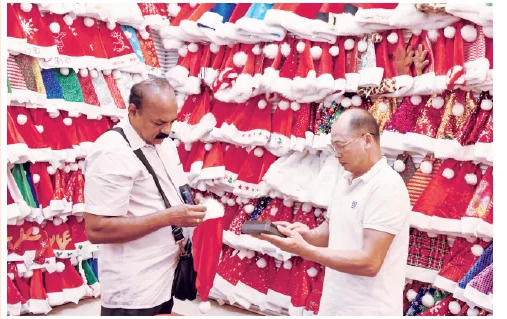 在义乌国际商贸城一区,不少经营户将新款圣诞产品摆在显眼位置,前来采购的外商络绎不绝。