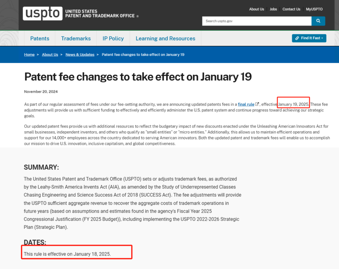 美国专利商标局(USPTO)宣布,自2025年1月18日起,美国商标的官方费用将上调,紧接着从2025年1月19日起,美国专利的官方费用也将上调。(具体请以各商标代理通知的截单时间为准)根据官方发布的费用调整信息,调整后的美国商标官方费用将增至350美元,最大增幅达到48%。