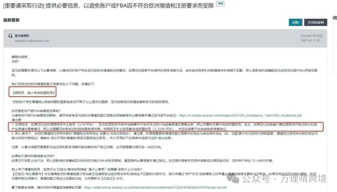 2025 年 1 月 1 日,欧盟《数字时代增值税改革方案》(ViDA)将全面生效,其核心目标是规范跨境电商税务征管,消除成员国间的税务监管漏洞。作为前期试点,西班牙税务局已率先启动卖家税号合规审查,并要求亚马逊等电商平台履行 “税号核验义务”—— 若平台未严格核查卖家税号有效性,将面临最高百万欧元的罚款。