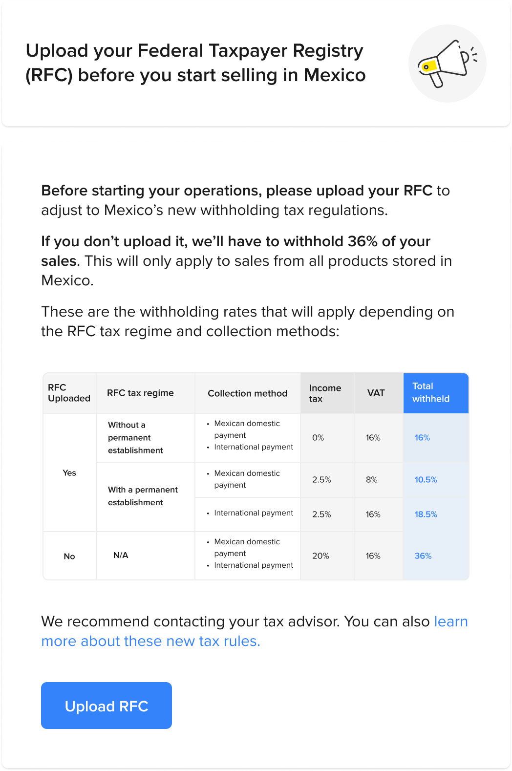 尚未上传 RFC 税号的卖家,需在 2025 年 12 月 23 日前完成上传,否则将面临销售额 36% 的预扣税费。