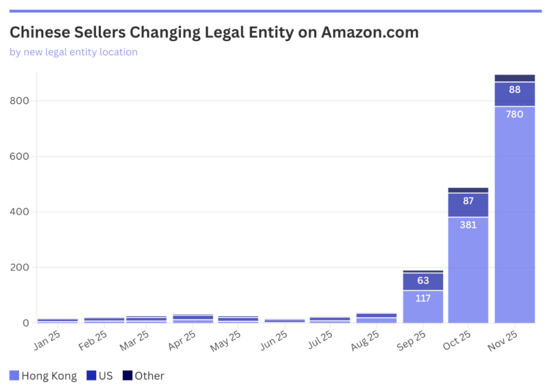 据 MarketPlacePulse 的监测数据显示,自2025年第三季度以来,亚马逊美国站内发起的账号主体属地变更案例增长显著。在8月份之前变更主体的操作发生数量维持在较低水平,且变更方向在中国香港公司与美国公司之间分布较为平均。