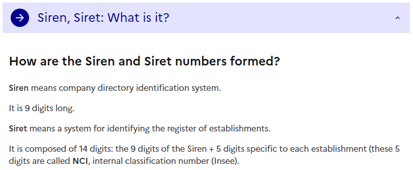 则为企业运营实体注册号,长度为 14 位,由 “9 位 SIREN 号码 + 5 位机构内部编号(NCI)” 组合而成,其作用是标识企业的具体运营地点,不同运营地点可能对应不同的 SIRET 号码。