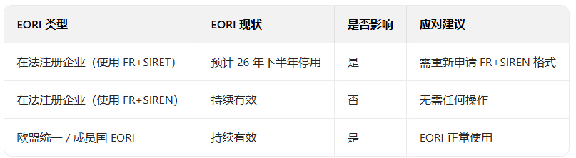 对于已关联有效 SIREN、且符合新规生成逻辑的 EORI,多数情况下可正常使用,无需额外更换,卖家可优先核查自身号码的关联主体与格式是否符合新规要求。