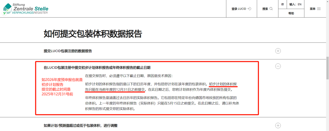 需在每年年末完成,卖家需向二元制回收系统及德国包装品中央登记处(LUCID)提交下一年度的包装投放预估数量,为环保费用核算与回收规划提供依据。