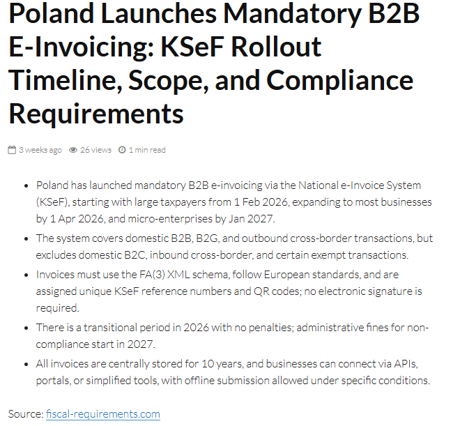 2026 年 2 月 1 日,波兰国家电子发票系统(KSeF)正式进入强制落地,标志着波兰税务合规体系从传统的双边文件交互模式,全面转向中央数据库实时登记的数字化管理。