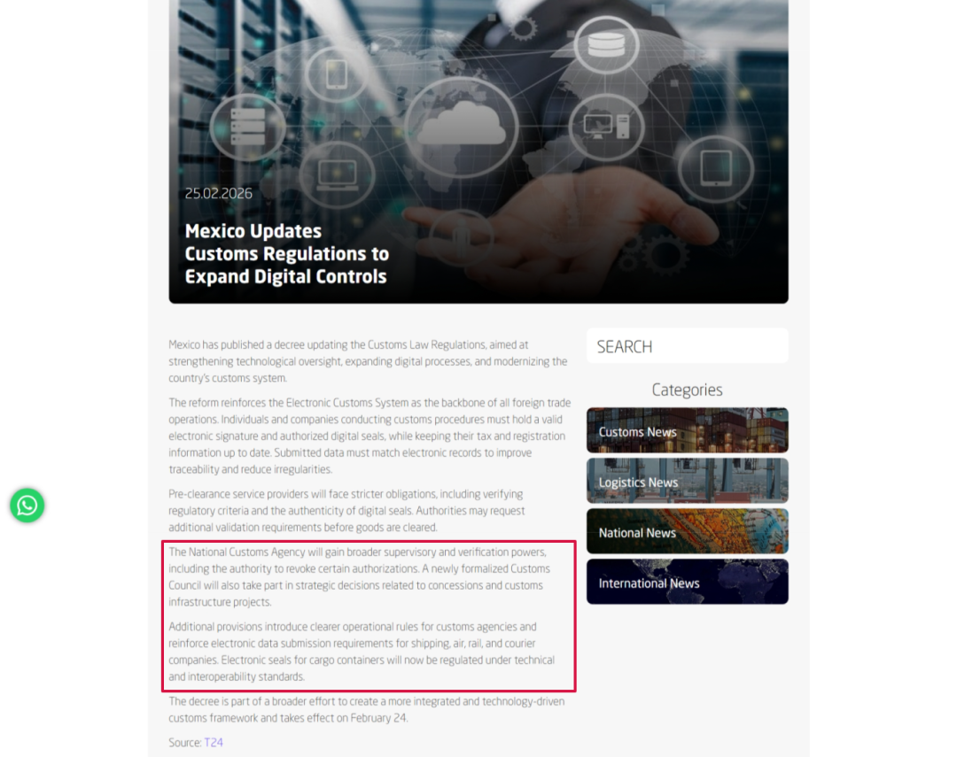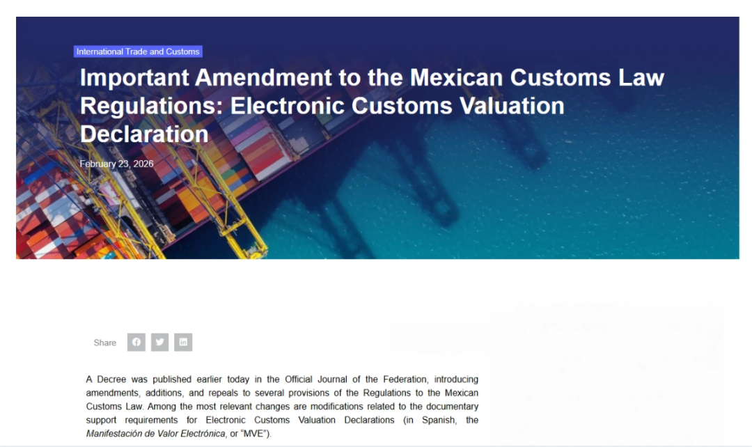 2026 年 2 月 24 日,墨西哥总统辛鲍姆签署的《海关法条例》深度修订案正式生效,距 1 月 1 日启动的 "十年最严" 海关法改革仅时隔两月。