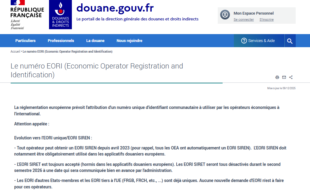 2026 年起,法国海关(DGDDI)正式推进 EORI 号码的层级升级,由原有的 SIRET 层级统一调整为 SIREN 层级,核心要求为 “EORI 与 SIREN 绑定,SIREN 需通过 VAT 注册获取”。