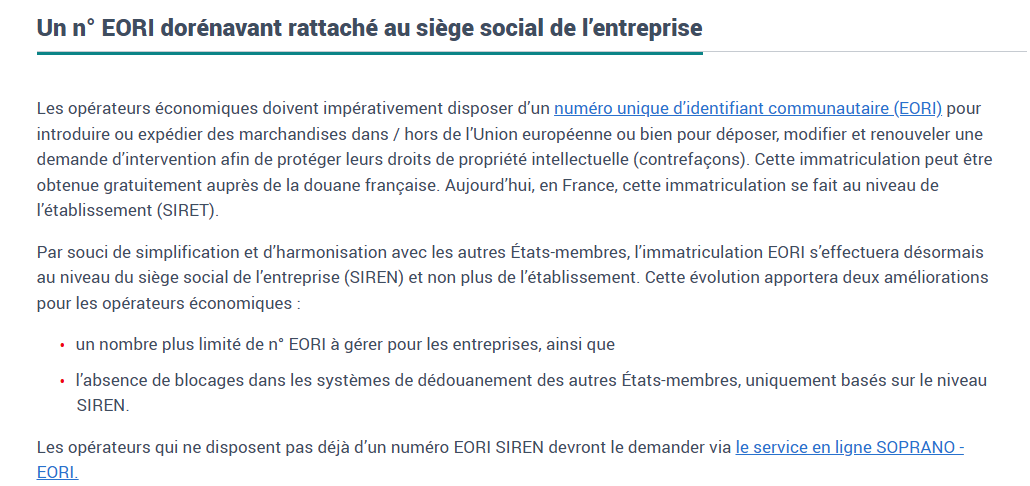 此前,法国允许企业基于具体经营地址(SIRET)申请 EORI,而本次改革后,一个经营主体(SIREN)仅能对应一个 EORI 号码。